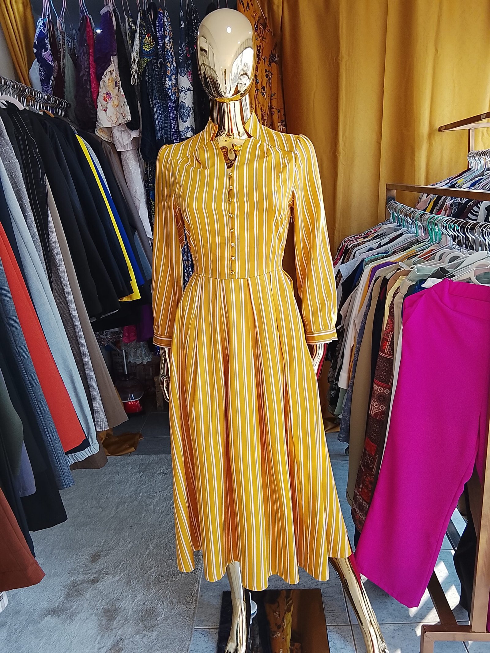 Dispondo do tamanho L, esta bata é projetada para oferecer um caimento perfeito que se adapta ao corpo de maneira confortável. O tom mostarda vibrante não só proporciona um agradável contraste com as riscas brancas, mas também faz uma declaração de estilo, garantindo que você se destaque onde quer que vá. A combinação de cores e o design contemporâneo fazem desta peça um item indispensável no guarda-roupa feminino.